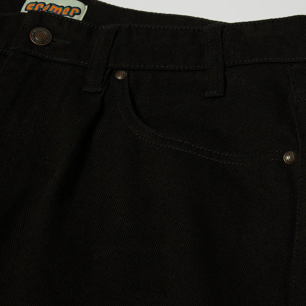 The Cromer Signature Pant is designed in collaboration with HUF team rider Brad Cromer for a '90s-inspired baggy jean combining all aspects of Brad's favorite pants. Made of heavy-duty cotton denim, this everyday skate pant is reinforced at critical seams and features an embroidered HUF logo at the coin pocket, a Cromer label at the waistband, and a generous taper at the leg.