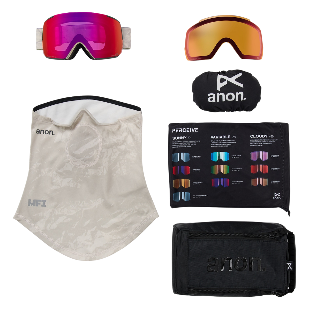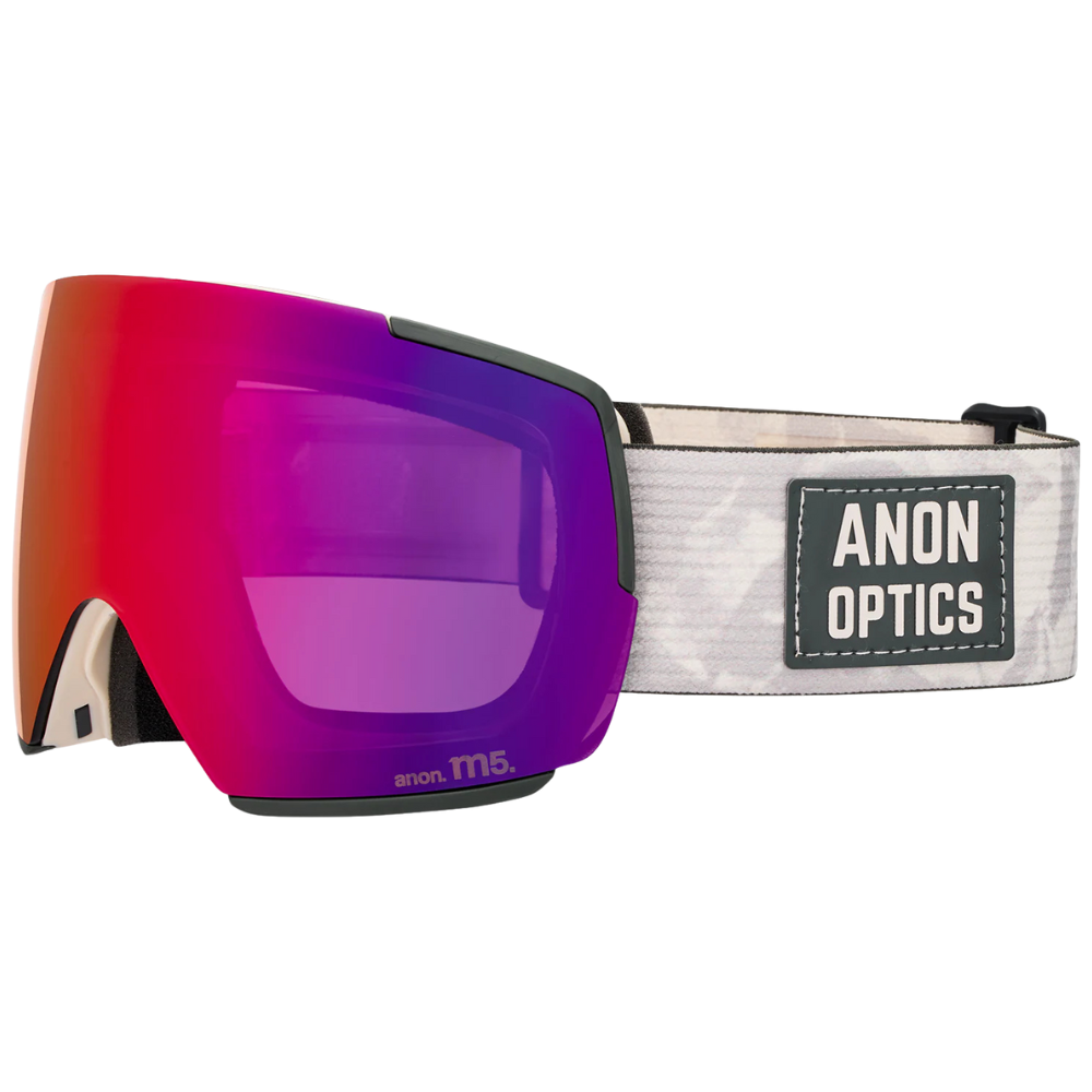 The Anon M5 Goggles offer a precise, comfortable helmet-to-goggle fit and an oversize modern aesthetic. The flat toric lens provides a wide field of view and enhanced peripheral vision. Our innovative Magna-Tech® quick lens-change technology uses powerful rare earth N52 magnets to make lens changes easier than ever. Perceive optics provide high-contrast, terrain-defining performance with our best anti-fog treatment for crystal-clear vision through a wide range of conditions. Magnetic Face Mask Integration (MFI®) provides seamless face mask attachment, and full-perimeter vents maintain consistent airflow for fog-free clarity. Includes a bonus lens for cloudy conditions, an MFI face mask, a Magna-Tech goggles storage case, and a goggles sock protector.