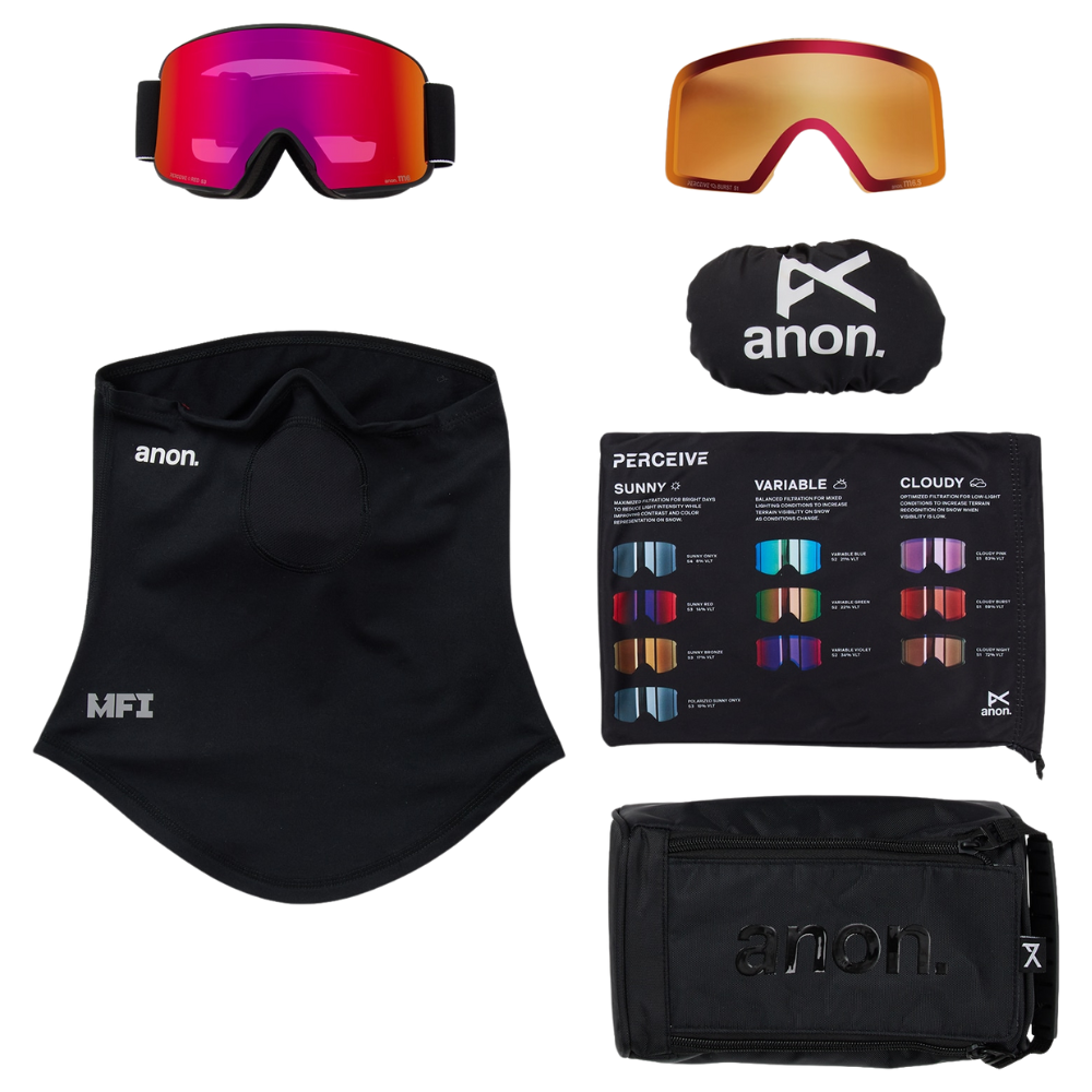 The Anon M6 Goggles offer a precise helmet-to-goggle fit with the wide field of view and low-profile design of a cylindrical lens. Our innovative Magna-Tech® quick lens-change technology uses powerful rare earth N52 magnets to make lens changes easier than ever. Perceive optics offer high-contrast, terrain-defining clarity. They feature our best anti-fog treatment for crystal-clear vision in a wide range of conditions. Full-perimeter venting plus moisture-wicking, ramped face foam creates a comfortable, form-fitting seal that supports fog-free clarity to anticipate every turn. Magnetic Face Mask Integration (MFI®) provides seamless face mask attachment. Includes a bonus Perceive lens so you're prepared for all conditions, plus an MFI face mask, microfiber goggle bag, and lens compression case.